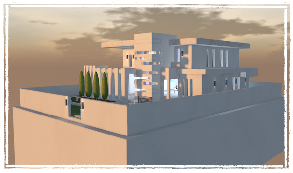 At only 198 prims, it is an impressive piece of architecture. It will fit on a 2048 lot if you cheat just a tad with the base hanging over the neighbor's. You can of course use this on the ground. See it in world HERE. The build includes some low impact furnishings for living room and dining (stool shown above) bringing the total impact count to 236.